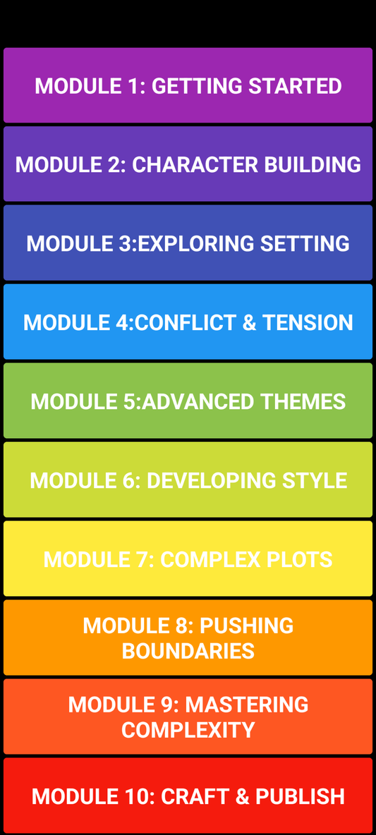 This comprehensive course offers guided video lessons, interactive quizzes, writing prompts, and practice exercises that grow in complexity — taking you from building a strong foundation to mastering the full craft of novel writing.