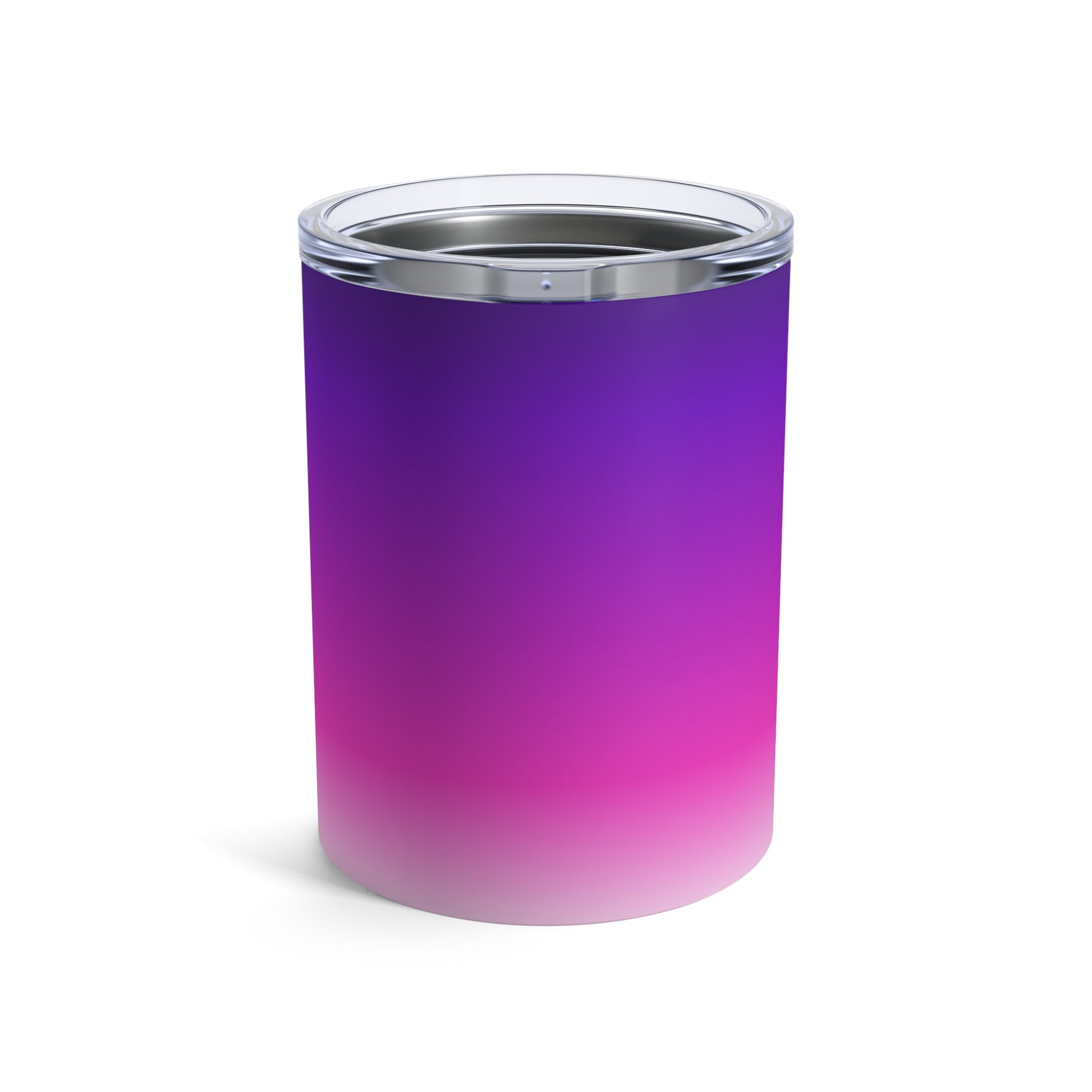 A compact, double-walled stainless steel tumbler wrapped in a dreamy ombré wash that fades from deep violet to rosy magenta and soft blush. It feels light in the hand but solid where it matters — vacuum insulation keeps morning coffee steaming or an evening cocktail chilled while the clear push-on lid seals in temperature without bulky caps. The rounded edges and 10 oz size make it easy to slip into a tote, cup holder, or the palm of your hand. Bring it along to quiet sunrise walks, desk-side work sessions, or small gatherings — it adds a subtle pop of color and keeps your drink exactly how you like it.