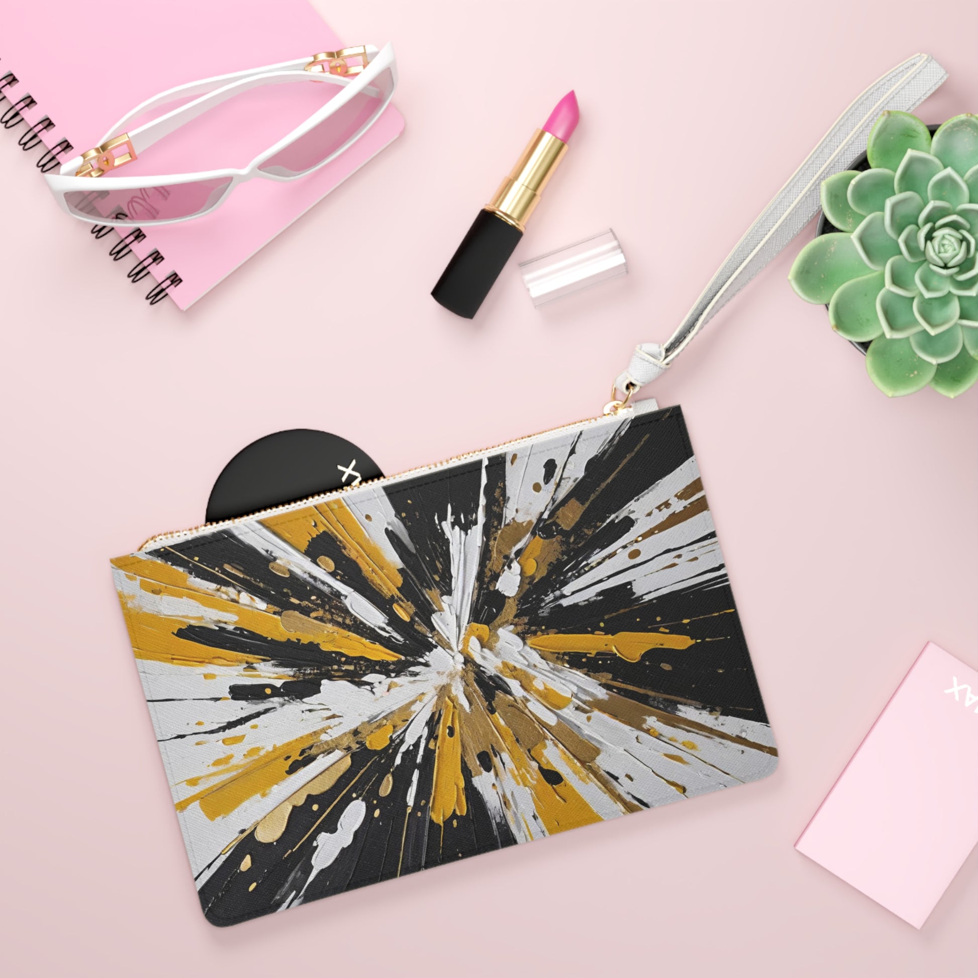 A compact clutch that feels like an art piece in your hand. The abstract splatter of black, yellow, white and tan creates a modern, slightly edgy mood—like catching a flash of street art on your way out. Lightweight and structured, it tucks a slim phone, cards, and keys into two compartments while a small inner pocket keeps receipts or a lip balm tucked away. The saffiano texture and gold-toned zipper catch light without shouting. Slip the wrist strap on and move through house parties, gallery openings, or neighborhood strolls with something that looks curated and lived-in at once.